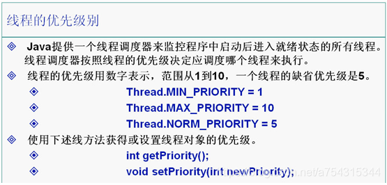 package cn.galc.test;public class TestThread6 { public static void main(String args[]) { MyThread4 t4 = new MyThread4(); MyThread5 t5 = new MyThread5(); Thread t1 = new Thread(t4); Thread t2 = new Thread(t5); t1.setPriority(Thread.NORM_PRIORITY + 3);// 使用setPriority()方法设置线程的优先级别,这里把t1线程的优先级别进行设置 /* * 把线程t1的优先级(priority)在正常优先级(NORM_PRIORITY)的基础上再提高3级 * 这样t1的执行一次的时间就会比t2的多很多 * 默认情况下NORM_PRIORITY的值为5 */ t1.start(); t2.start(); System.out.println("t1线程的优先级是:" + t1.getPriority()); // 使用getPriority()方法取得线程的优先级别,打印出t1的优先级别为8 }}class MyThread4 implements Runnable { public void run() { for (int i = 0; i <= 1000; i++) { System.out.println("T1:" + i); } }}class MyThread5 implements Runnable { public void run() { for (int i = 0; i <= 1000; i++) { System.out.println("===============T2:" + i); } }} run()方法一结束,线程也就结束了。