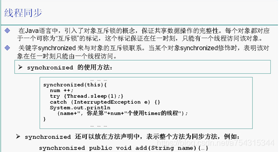 package cn.galc.test;public class TestSync implements Runnable { Timer timer = new Timer(); public static void main(String args[]) { TestSync test = new TestSync(); Thread t1 = new Thread(test); Thread t2 = new Thread(test); t1.setName("t1");// 设置t1线程的名字 t2.setName("t2");// 设置t2线程的名字 t1.start(); t2.start(); } public void run() { timer.add(Thread.currentThread().getName()); }}class Timer { private static int num = 0; public/* synchronized */void add(String name) {// 在声明方法时加入synchronized时表示在执行这个方法的过程之中当前对象被锁定 synchronized (this) { /* * 使用synchronized(this)来锁定当前对象,这样就不会再出现两个不同的线程同时访问同一个对象资源的问题了 只有当一个线程访问结束后才会轮到下一个线程来访问 */ num++; try { Thread.sleep(1); } catch (InterruptedException e) { e.printStackTrace(); } System.out.println(name + ":你是第" + num + "个使用timer的线程"); } }} 线程死锁的问题: